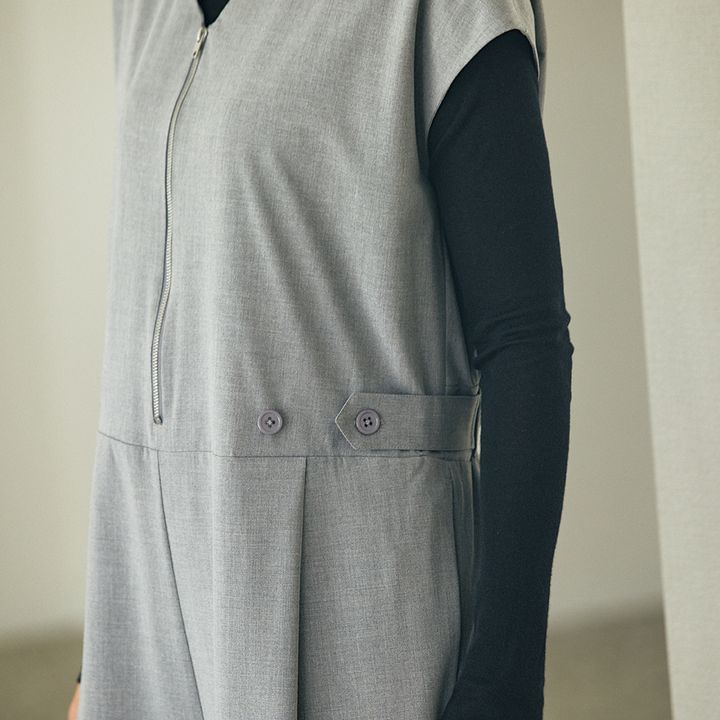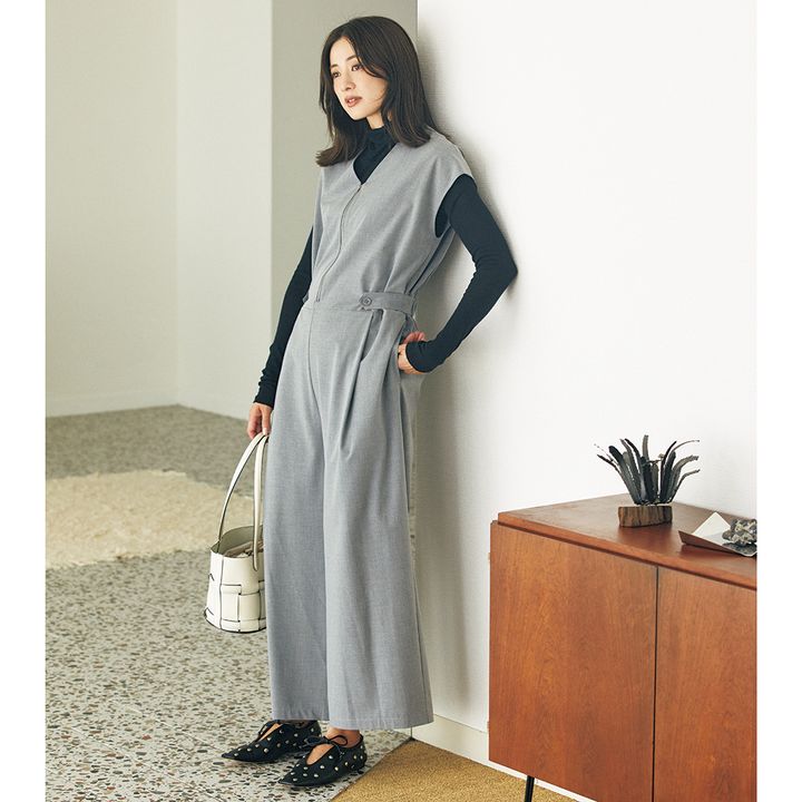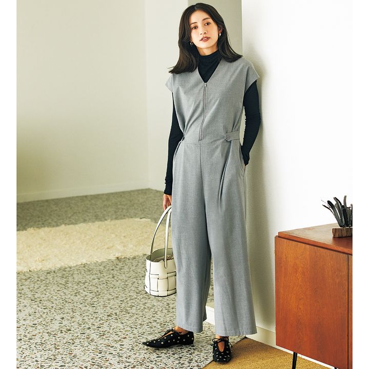 一枚でサマになるオールインワンも、秋素材&旬のジャンプスーツ調デザインに更新すれば簡単にフレッシュな着こなしに。まだ暑い初秋、一枚で着ても二の腕が気にならないフレンチスリーブ、デコルテをシュッと見せるVネックと大人のカラダを美しく見せます。