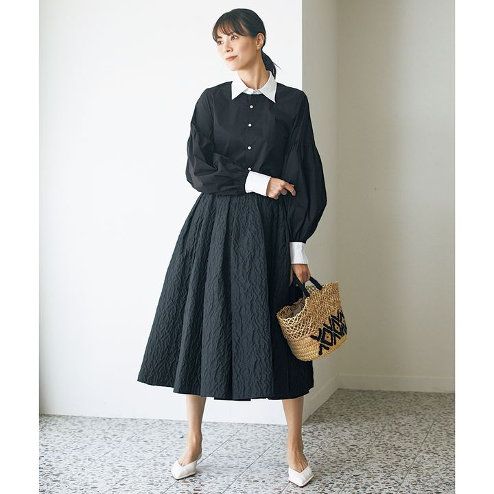 <写真2枚目>ALLブラックも、首元の白衿が絶妙な抜け感に。シャツは色違い。スカート¥36,300(シーニュ)バッグ¥14,300(ケッシュ ル エッセンシャル)シューズ¥39,600(ピッピシック/ベイジュ)
