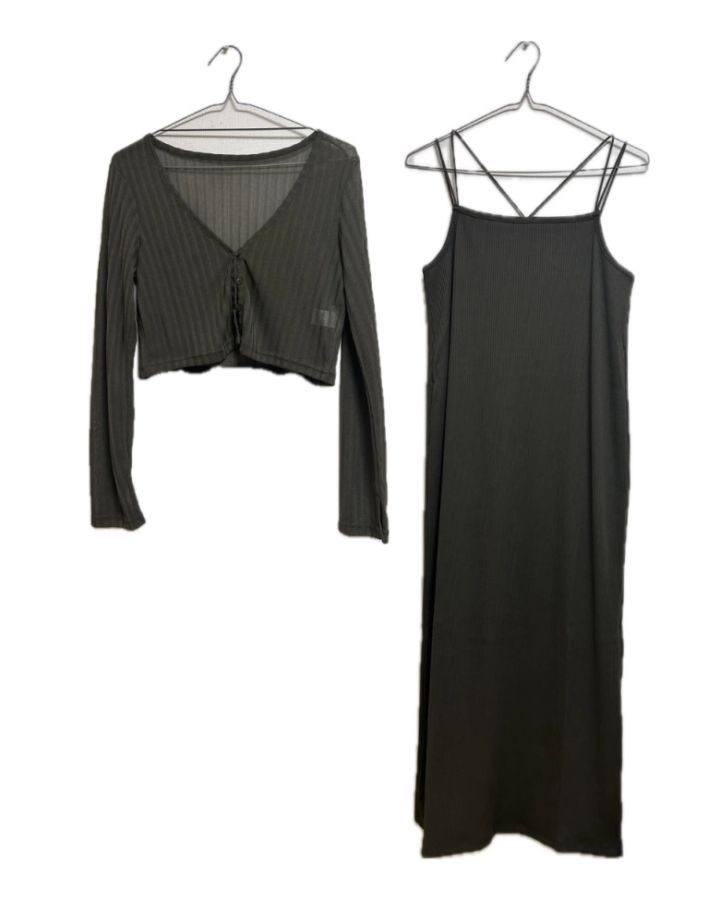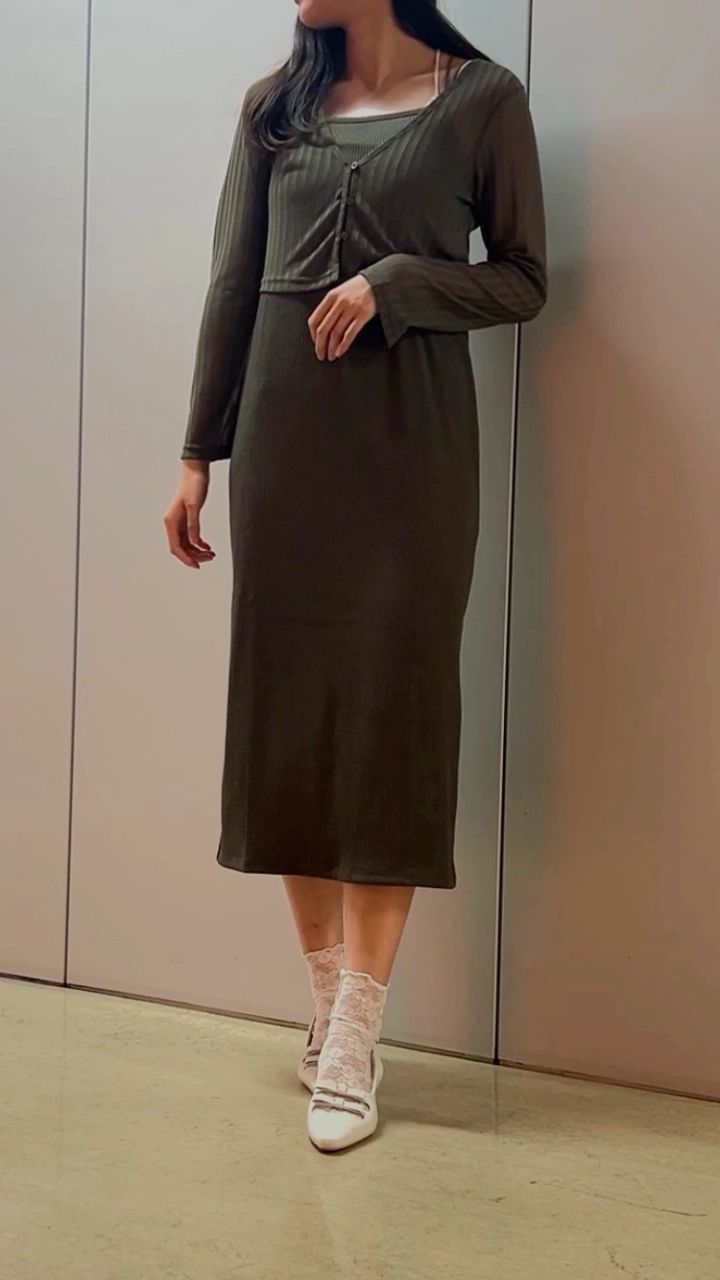 秋っぽさ全開のカーキ色♡ リブニットのキャミワンピースと短丈カーディガンのセットアイテム。体のラインをひろいながらもゆったりしているキャミワンピースは女性らしさが◎。またカーディガンはシアー素材で、まだ暑い日もある今の時期にぴったりです!