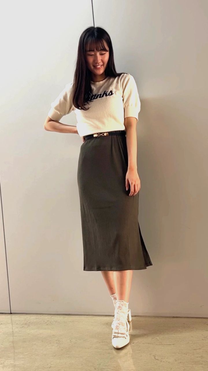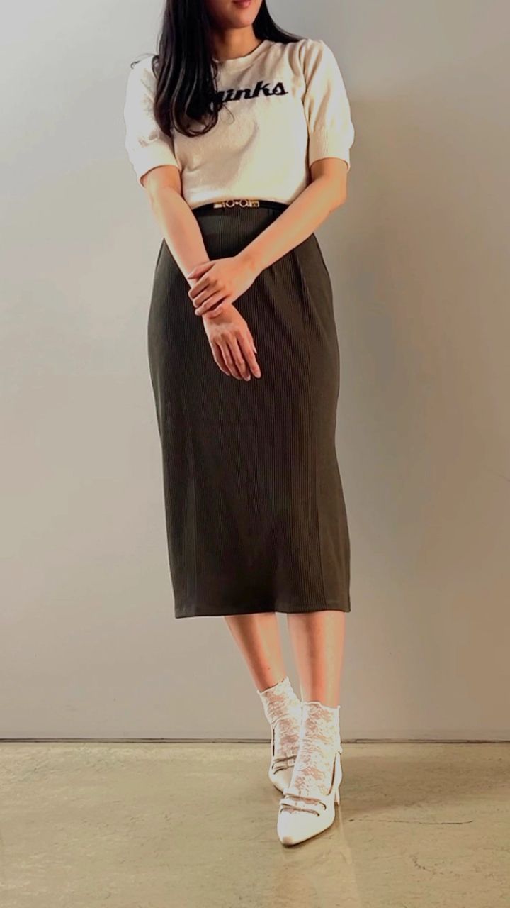 スカートはキャミワンピースを着回し。ロゴ入りニットトップス、ベルト/ともにems excite