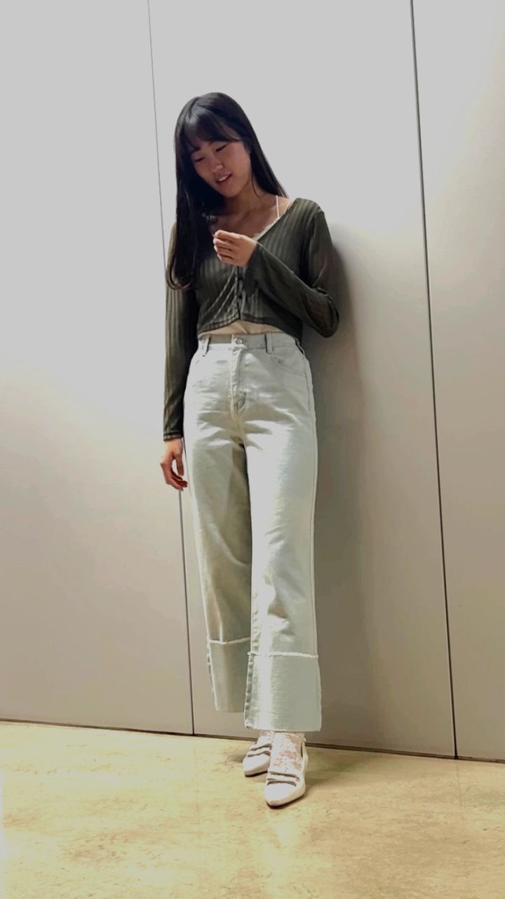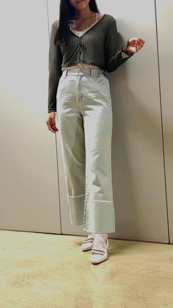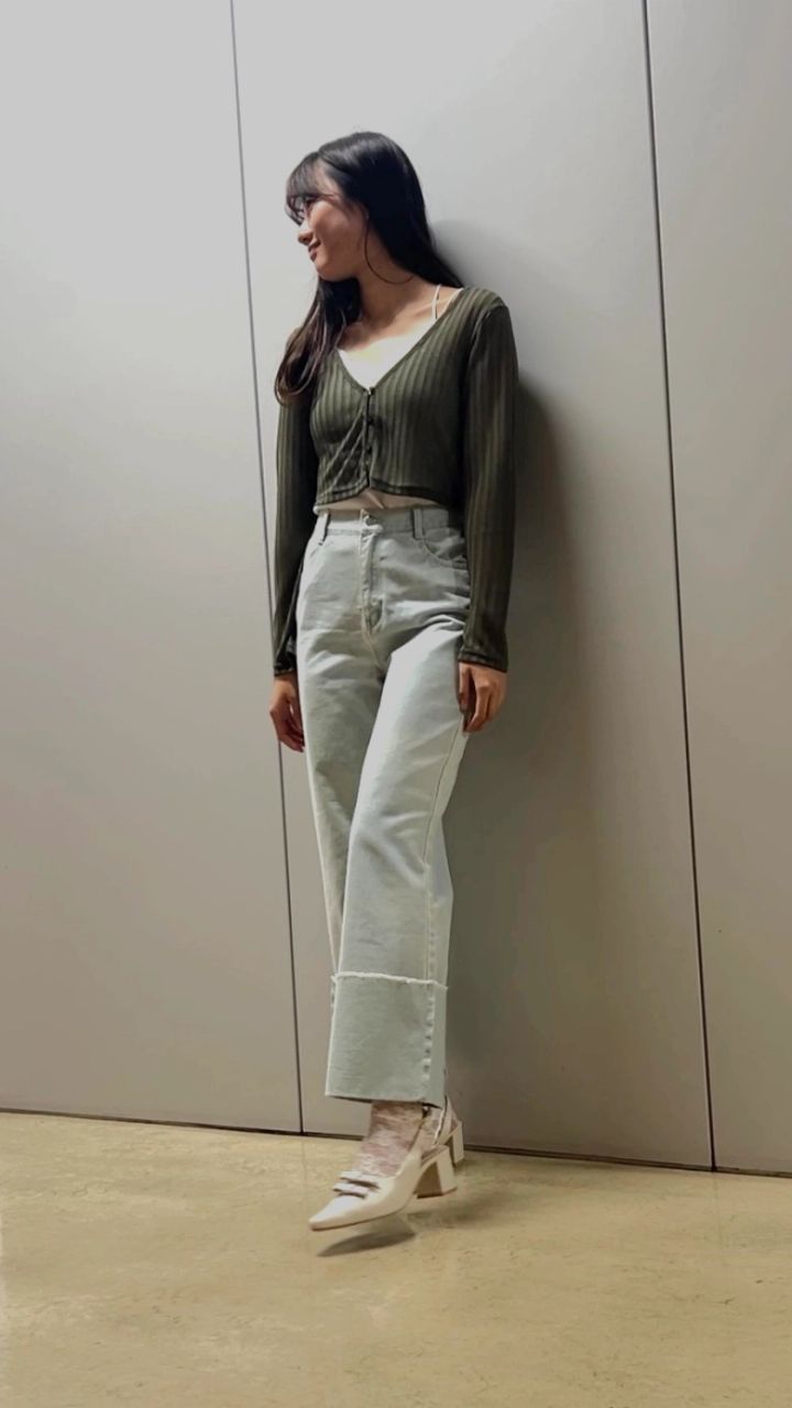 カーディガンを着回し。ショート丈なのでスタイルアップ効果抜群!ほどよい透け感で大人な女性らしさもメイク♡