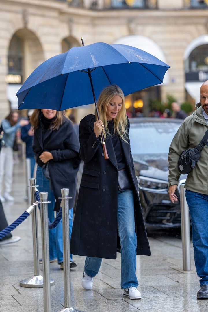 また、翌日も「コルテッツ」を履き、雨の降るパリの街に現れたグウィネス。この日は、ブラックのダブルブレストコートに、ウォッシュのかかったストレートジーンズを組み合わせたシンプルな着こなしを披露した。