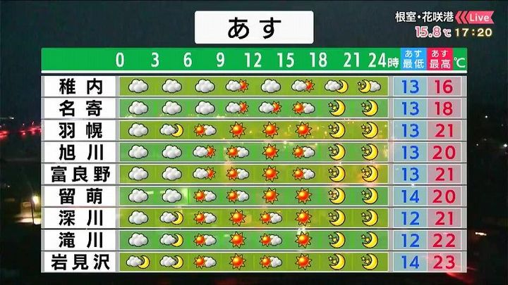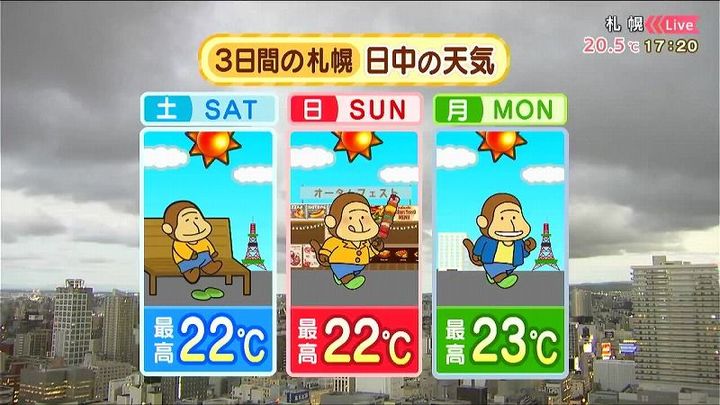 最高気温は稚内やオホーツク海側で16度前後と10月並みのほかは、23度前後と平年より3度ほど高い予想です。