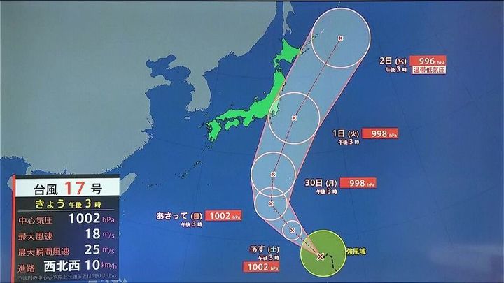 現在日本のはるか南にありますが、その後北上して、来週火曜日水曜日と日本の東を進んでいく予想です。