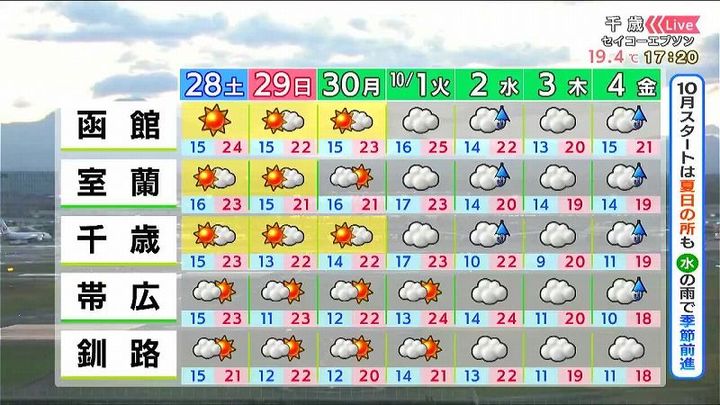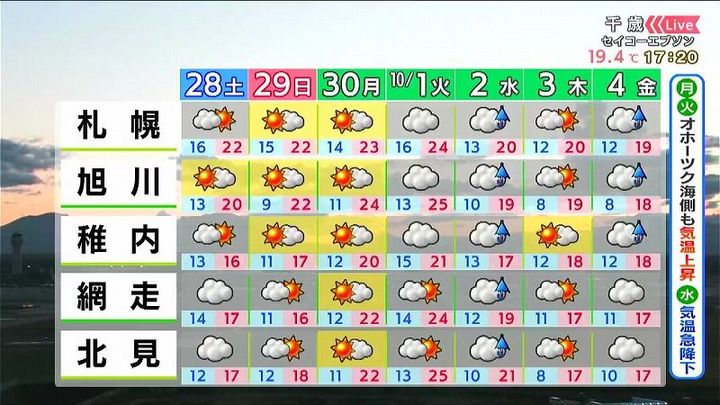 月曜日にはオホーツク海側の寒さも解消しそうです。10月スタートの火曜日は旭川や北見で25度と夏日の予想です。
