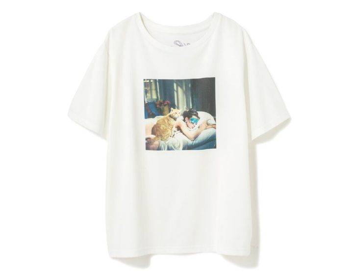 映画『ティファニーで朝食を』の名シーンをプリントしたTシャツは白2柄と黒1柄の3種展開。¥5,489(オードリー・ヘプバーンコレクション バイ ロペピクニック/ロペピクニック TEL:0120・298・133)