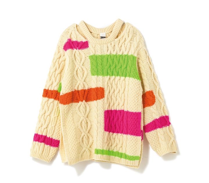 軽さのあるフレンチメリノウールに、形状や素材の違うネオンカラーの糸が編み込まれたケーブルニット。首元と両サイドに入ったカットアウトがポイント。¥49,500(アメンダ TEL:03・5775・3383)
