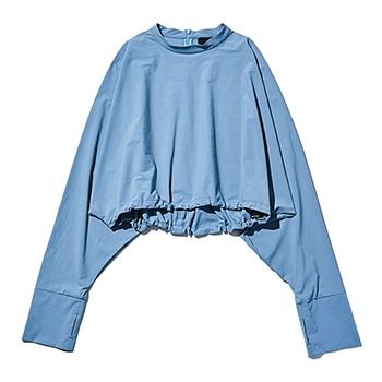 「ドルマンスリーブやモックネックのデザイン性で、タウンユースにも向くラッシュガード。すそのドロスト次第で立体感を出せるため幅広いボトムに似合う」(73 Showroomプレス・菅原風向さん)