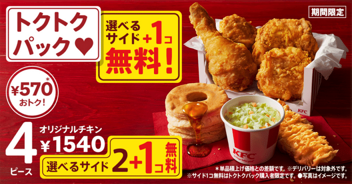 2024年10月2日(水)から10月22日(火)までの期間限定で、全国のケンタッキーフライドチキン(以下:KFC)店舗にて、「秋のトクトクパックサイド1個無料」キャンペーンが実施されます。KFCの定番パック「トクトクパック」に、今だけサイドメニューが1個無料でついてきますよ~。