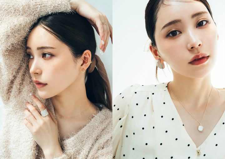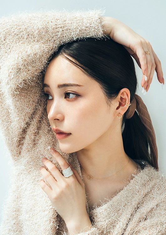 ネックレス(K10PG×K10YG)¥30,800、ピアス(K10PG)¥30,800、イヤカフ(K10PG)¥18,700、【左手薬指】リング(K10PG)¥31,900、【右手人さし指】リング(SV925)¥36,300/以上KAORU(KAORU ルミネ有楽町店) 2wayニット¥9,900/ノエラ