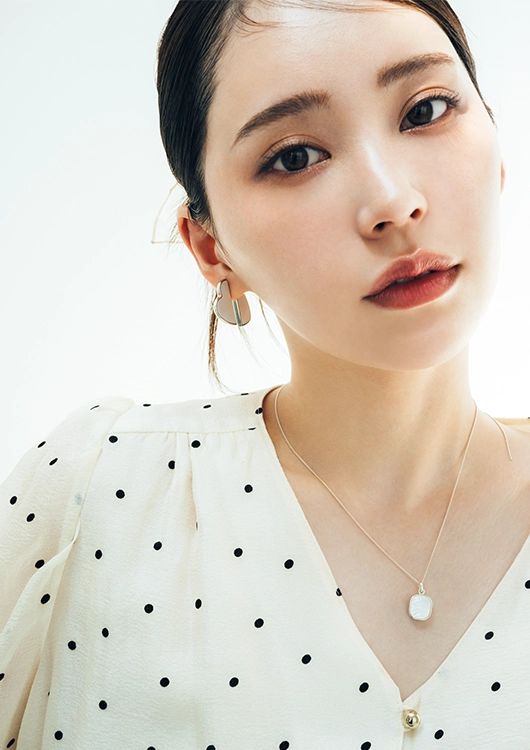 ネックレス(白蝶貝×SV925)¥27,500、ハートピアス[片耳販売](MOP×SV925)¥35,200/ともにプラウ ドットブラウス¥17,600/ジャスグリッティー