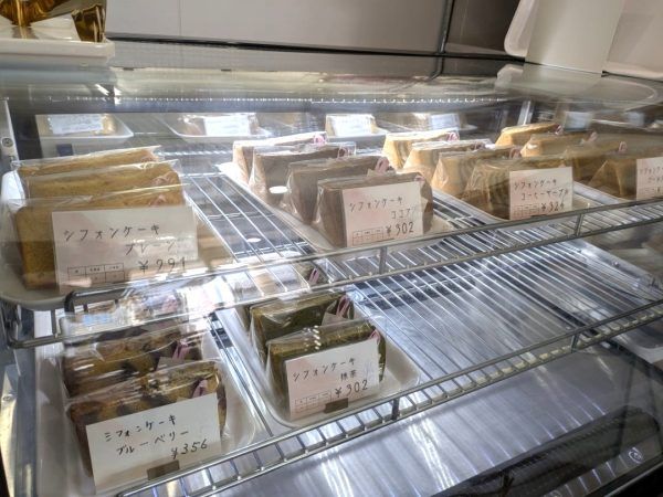今年1月にオープンしたこちらのお店は、米粉スイーツの専門店です。 お店に入ると、奥はオープンキッチンのようになっていて、手前のガラスケースの中にはシフォンケーキが6種類ほど並んでいました。14時くらいだったのですが、大分売り切れてしまって種類が少なくなっているとのこと。日頃は15種類程度のシフォンケーキが並んでいるそうです。クリームサンドは完売だったのが残念。