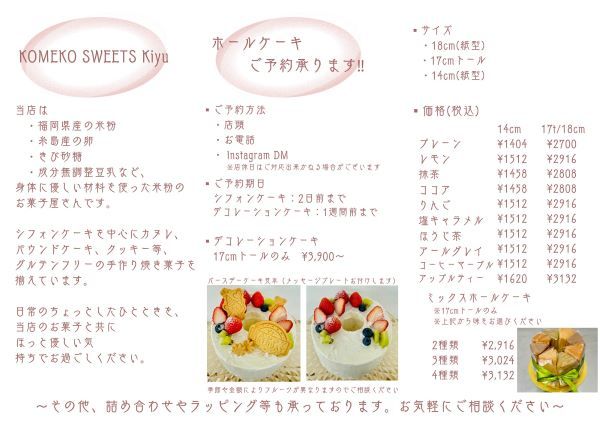 「体に優しいスイーツを沢山用意しています。グルテンフリーの美味しいお菓子を届けたい!と思っています。」とオーナーの大城(おおぎ)さん。 グルテンフリー派の方は勿論、どなたでも大満足できる、「KOMEKOSWEETS Kiyu」のおいしい米粉スイーツを、ぜひ食べてみてくださいね。