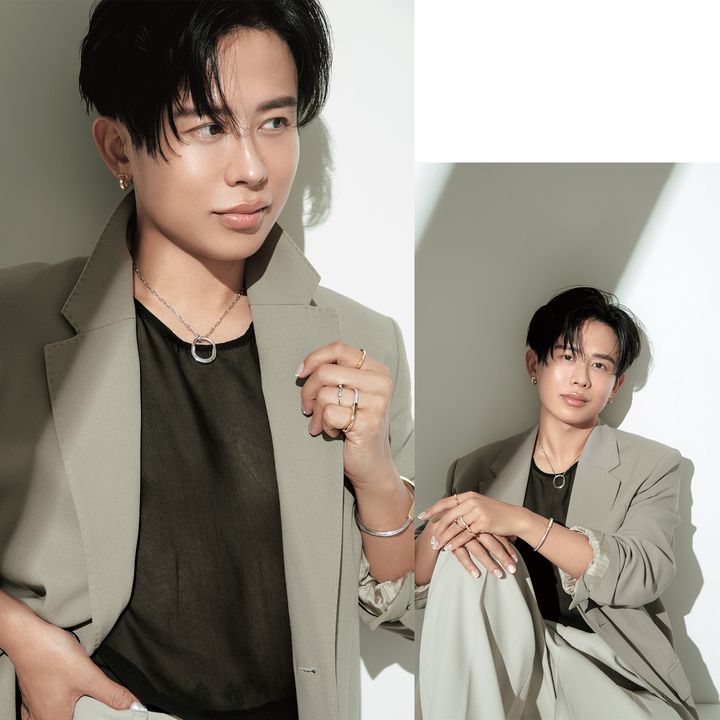 ジャケット¥160,600トップス¥49,500 パンツ¥130,900(すべてアミ/アミ パリスジャパン)ピアス¥682,000 ペンダント¥698,500 バングル¥2,475,000リング[人差し指]¥550,000[薬指]¥220,000 Wフィンガーリング¥1,386,000(すべてティファニー/ティファニー・アンド・カンパニー・ジャパン・インク)