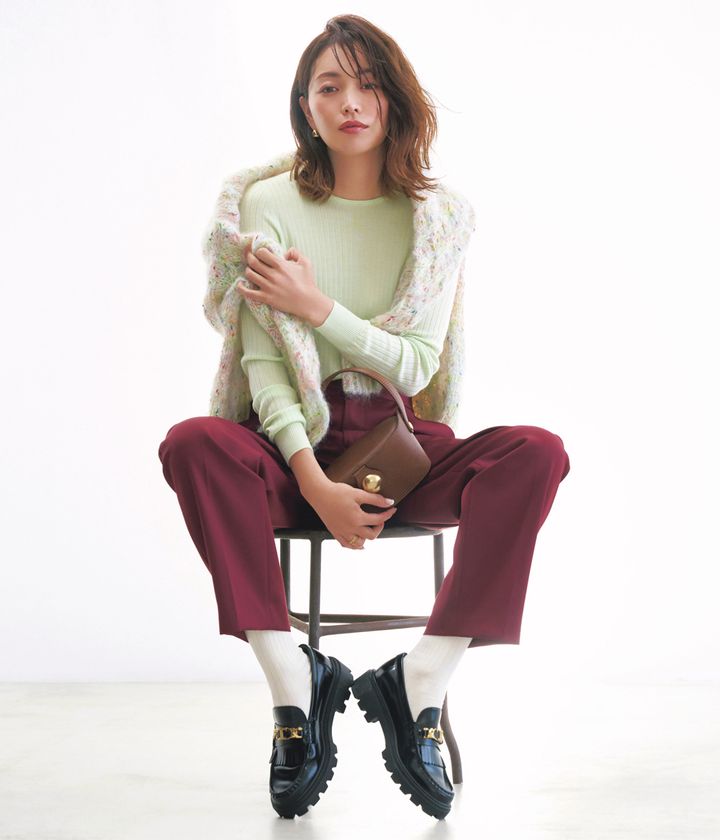 ローファー¥119,900(トッズ/トッズ・ジャパン)ニット¥49,500肩に巻いたカーディガン¥96,800パンツ¥75,900(すべてドゥロワー/ドゥロワー 二子玉川店)バッグ¥51,700〈ニューイ〉ピアス¥15,400〈カラ・ユ〉(ともにショールーム ロイト)リング付け根側¥396,000リング指先側¥184,800(ともにホーセンブース/リトルリーグ インク)靴下/スタイリスト私物