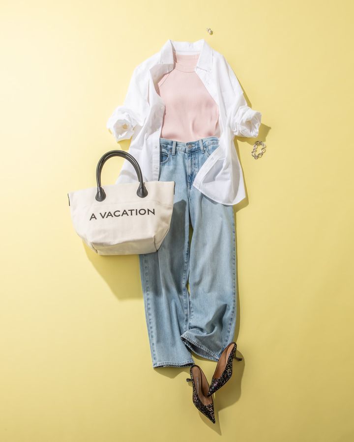 二の腕やデコルテ全開で着るには勇気がいる、という人も多いであろう話題のホルターネックも、オーバーサイズシャツで一発解決。タンクトップはウエストインすればシャツとのバランスも◎。全体がシンプルなぶん、ラメパンプスでワンポイントを。