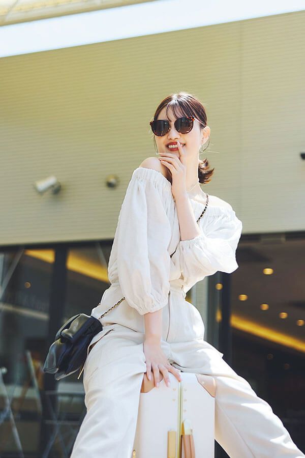 チェーンバッグの斜め掛けや、サングラスで爽やかなホワイトコーデにスパイスを。肩見せでヘルシーな可愛さもアピール♡