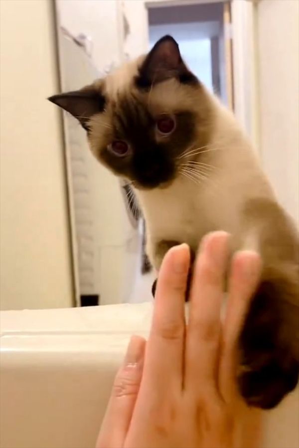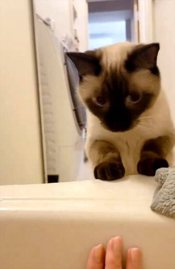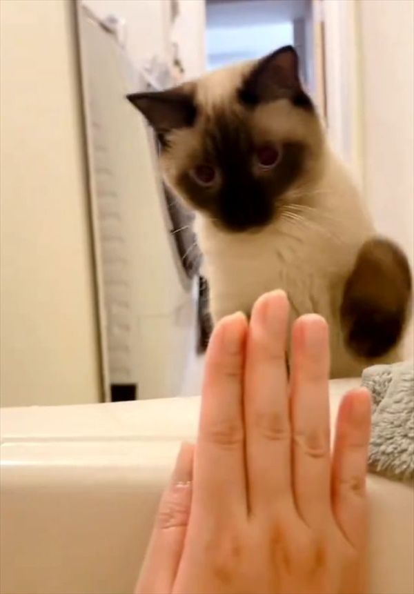 飼い主さんをじっと見つめるネコ。 そこで、目の前に飼い主さんが手を差し出すと・・・意外な猫パンチを放ったのです!!