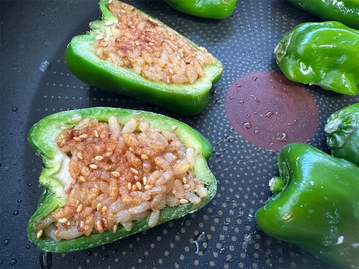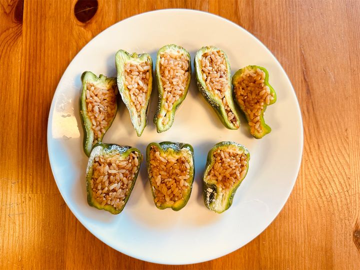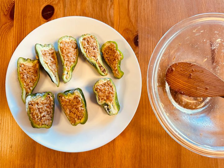 8個のピーマンに、ご飯がぴったりおさまりました!こういうのうれしいですね(笑)。