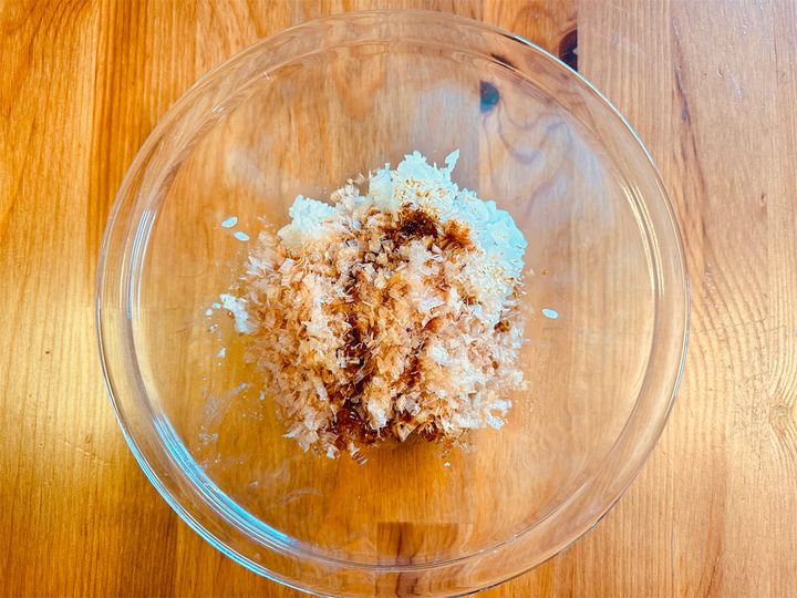 2.ボウルにご飯、白ゴマ、花かつお、しょうゆを加え、ご飯がパラつかないよう混ぜる。
