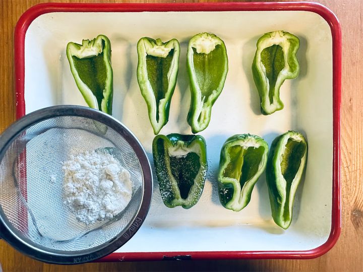 1.ピーマンは縦半分に切り種を除き、内側に小麦粉をまぶす。
