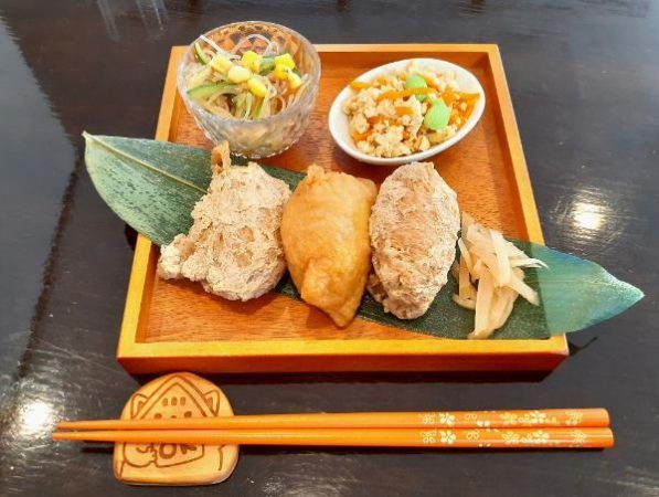 メニューは「きゅうりとハムの春雨サラダ」「コク旨白和え」の野菜の小鉢2品がついたお稲荷さんです。