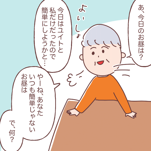すると「よいしょっと。あ、今日のお昼は?」そう言いながらとっとと座り込む義母に、「今日はユイトと私だけだったので簡単にしようかと・・」キョウコさんが答えると「やーね、あなた。いつも簡単じゃないお昼は。で、何?」お昼が気になって仕方ない様子の義母。