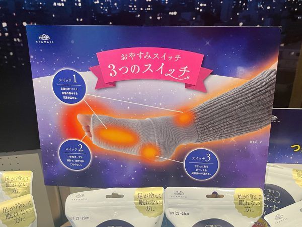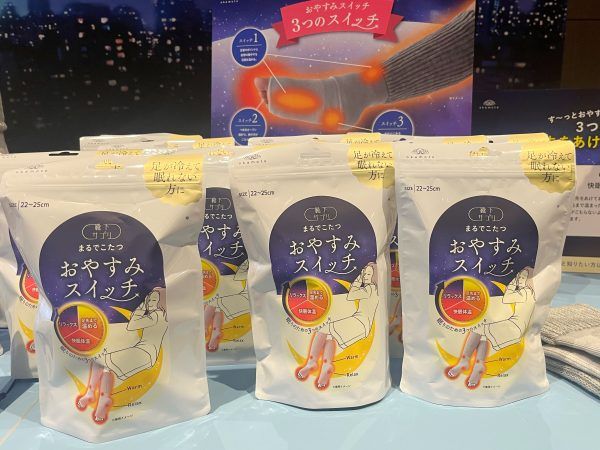睡眠の質を改善するというヤクルトとの共通点で、「おやすみスイッチ」という靴下が、私はとても気になりました!その分かりやすいネーミングで大ヒットした「まるでこたつソックス」を作った会社が新しく開発し、この冬に向けて発売される新商品です。