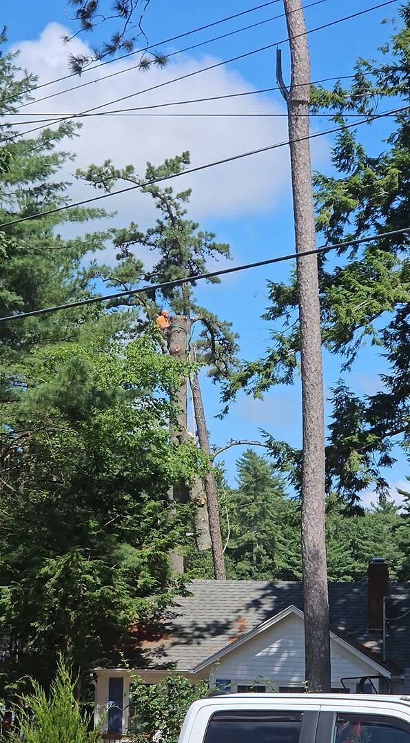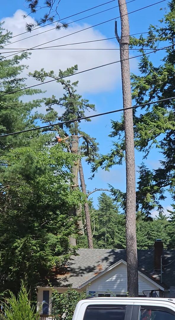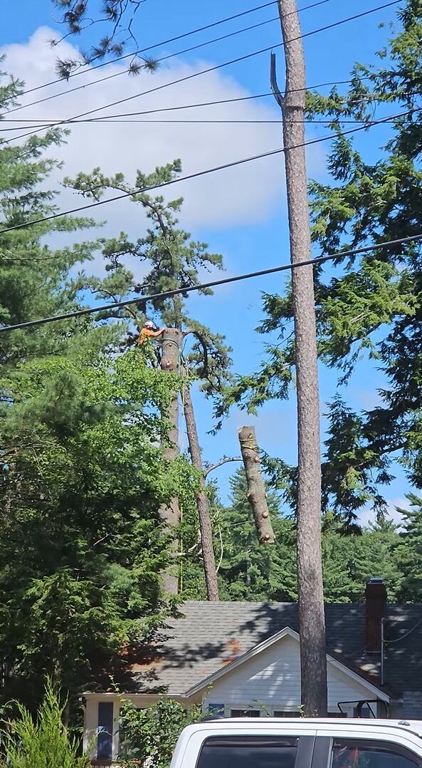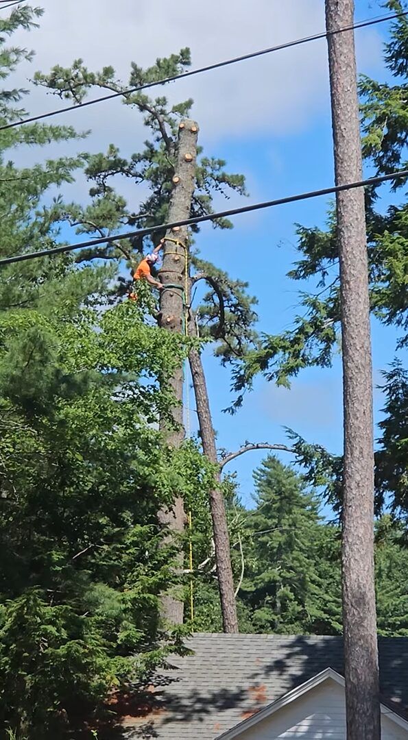 この日は、木の上の方だけを伐採する半伐採が行われていました。 木に上った作業員が、枝を払いカットした木の幹を倒そうとしています。