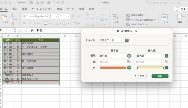 ダブルクリックで瞬時に列幅をきれいに整えるなどの項目を順調にクリアしていきましたが、スケジュール表の土日を自動的に色付けする時短技でつまづきました。