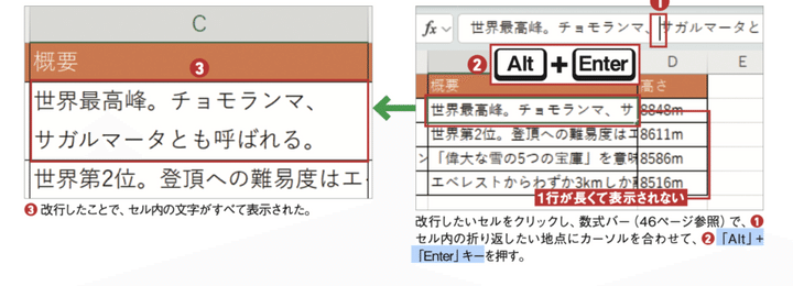 いつもエクセルって見にくいと思っていたのですが、簡単に改行できるんですね。これは知らなかった! ちなみに②の「Alt+Enter」は、Macの場合は「command+option+Enter」でした