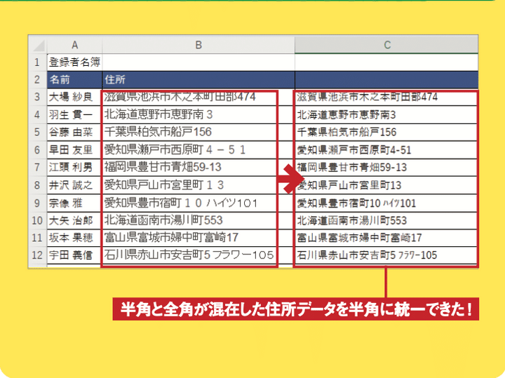 大雑把なくせに妙に几帳面なところもあって、上記のように半角とか全角が揃っていないと気になっちゃう性格でして。なので、全角・半角の混在を一気に統一できるのが気持ちよかったです! これは「ASC関数」や「PHONETIC関数」というものを使うのですが、本には私でもわかるように簡単に書いてあったから、安心してください