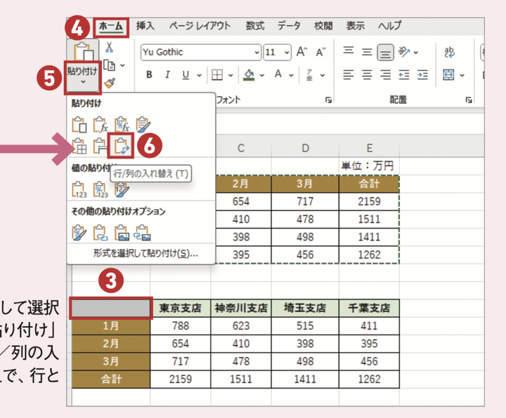 解説どおりに進めると、なぜか⑥の「行/列の入れ替え(T)」がどうしても見つからずに断念。私のPCがMindowsではなくMacだからかな? 原因を引き続き探ってみます!