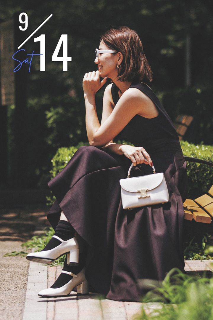 ストラップパンプス[H6.5㎝]¥154,000 バッグ¥467,500 ※予定価格(ともにセリーヌ バイ エディ・スリマン/セリーヌ ジャパン)タンクトップ¥20,900(ロンハーマン)スカート¥162,800(ハルノブムラタ/ザ・ウォール ショールーム)サングラス¥41,800(アヤメ)ピアス¥37,400(ブランイリス/ブランイリス トーキョー)ソックス/スタイリスト私物