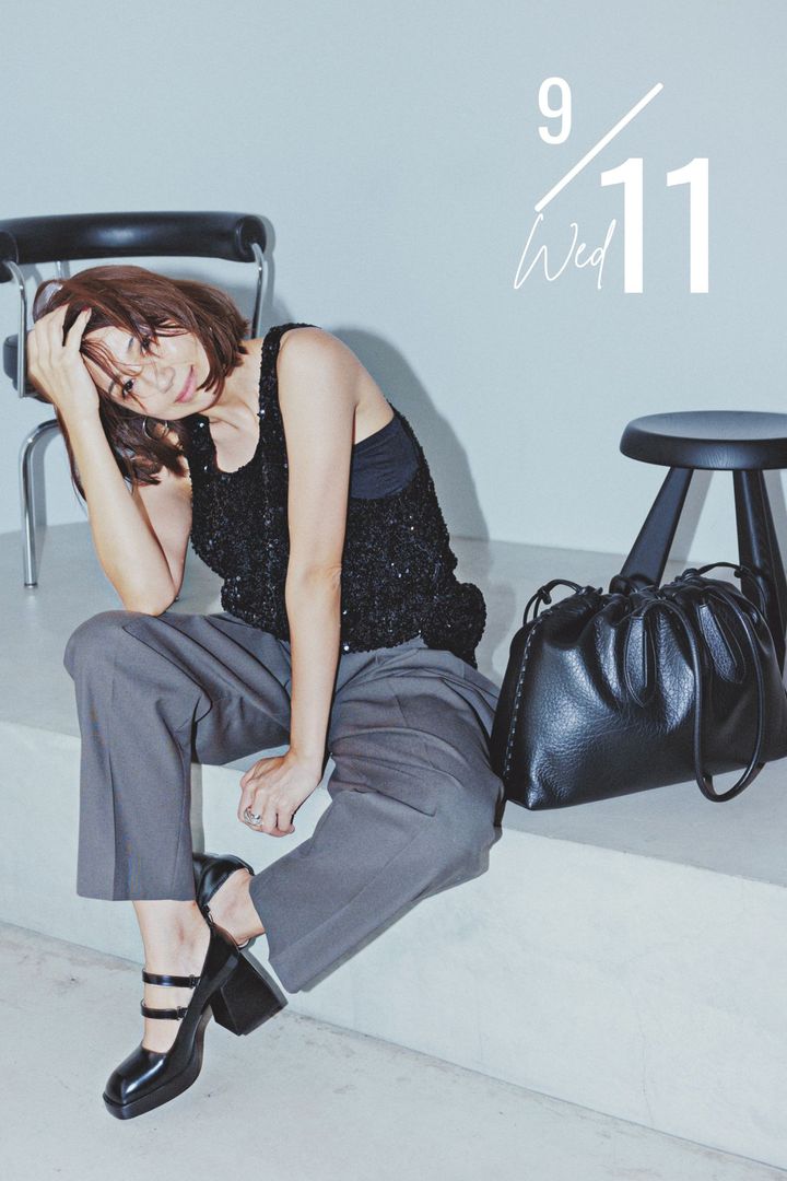 ダブルストラップシューズ[H8㎝]¥137,500(ノダレト/エストネーション グランフロント大阪店)スパンコールトップス¥75,900(アンスクリア/アマン)タックパンツ¥26,400(スタニングルアー/スタニングルアー 新宿店)ピアス¥68,200(モニス/フォーティーン ショールーム)リング¥49,500(ブランイリス/ブランイリストーキョー)バッグ¥20,900(ADD CULUMN/アンソロジー)インナー/スタイリスト私物