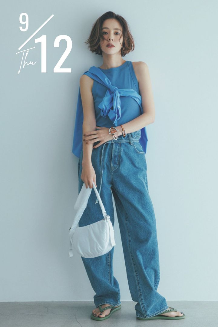 チュールブラウス¥18,700(マイストラーダ)タンクトップ¥13,200(ボーダーズ アット バルコニー)サンダル¥2,750(イパネマ/シードコーポレーション)パンツ¥13,200(ジーンズファクトリークローズ/ジーンズファクトリー 卸団地本店)ピアス¥19,800リング¥16,500(ともにココシュニック オンキッチュ/ココシュニック)ネックレス¥7,700(ロニ)バングル¥82,500(プリュイ/プリュイ トウキョウ)バッグ¥126,500(J&M デヴィッドソン/J&M デヴィッドソン カスタマーセンター)