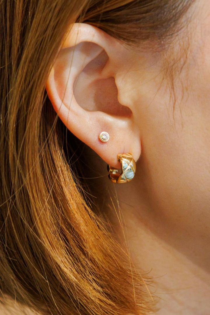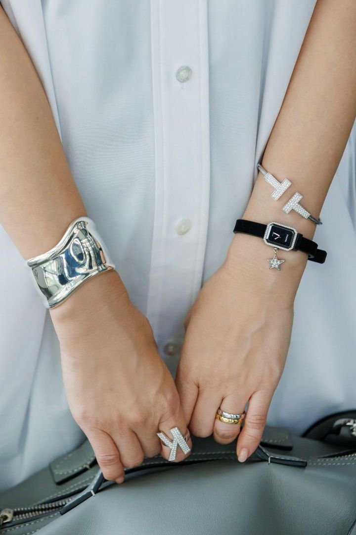 「夏は特にホワイトジュエリーをつけたくなるので、今年はティファニーTのダイヤバングルを購入しました。あえて、シルバーのボーンカフとホワイトゴールドのブレスレットを合わせることで、エッジを効かせつつ大人な手元に見せることができます。イニシャルのKリングとティファニーのブレスのTで、自分のイニシャル(Kumiko Tonomura)になっているところもひそかなポイント(笑)。お気に入りのクリアピアスでさらに抜け感と涼やかさをプラスします」