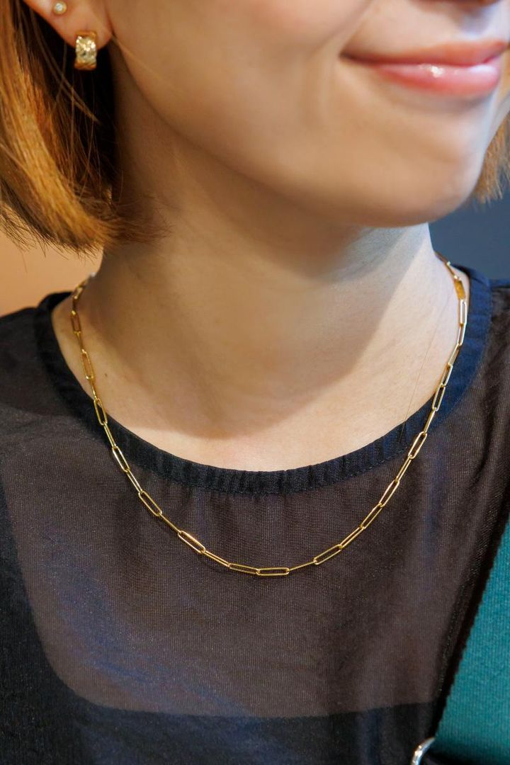 「雨なので、汚れが目立たない黒パンツにスニーカースタイルで出勤。ジュエリーはゴールドでまとめ、ヴィンテージアクセサリーをジャラッと多めにつけて個性を発揮。ブレスはどちらもElementaryParticlePalmGardenというお気に入りのヴィンテージショップで見つけた一点もので、ほかの人とかぶらないのがうれしいです。スニーカーの日はラフになりすぎないよう、ジュエリーをいつもよりしっかりつけるように。たくさんつけていますがゴールドでまとめているので、うるさく見えないのがポイントです」