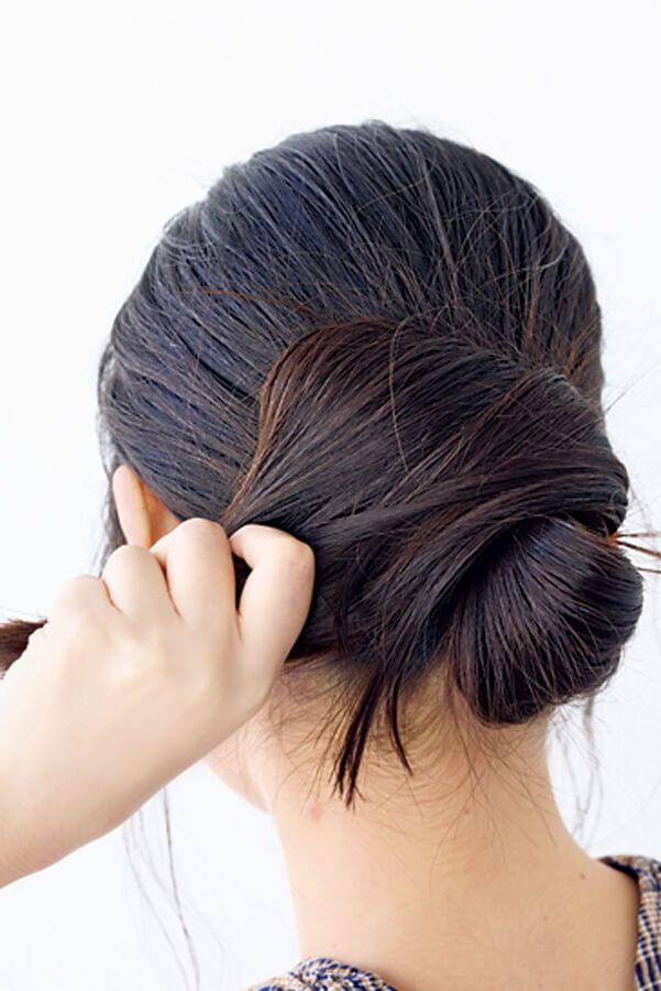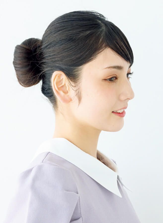 黒髪の分量を減らしてすっきりした印象になるシニョンは、きっちりさせすぎないのがポイント。おだんごからハネる毛先をあえて残して遊びをつくることで、普段使い仕様に。