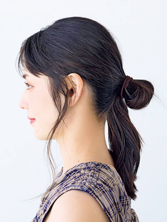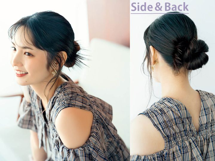 前髪と、顔周りにおくれ毛を残し、まとめた髪を耳より低い高さに結ぶ。最後は抜き切らずにおだんごに。