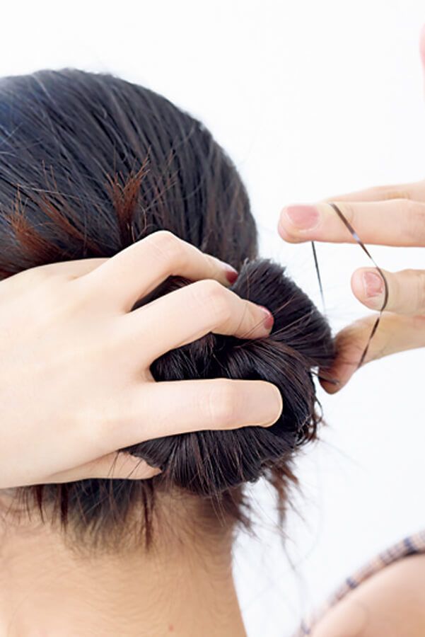 2でねじった毛束を押さえながら、上からシリコンゴムを重ねて結び、ピンを数カ所留めて固定する。