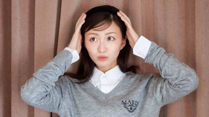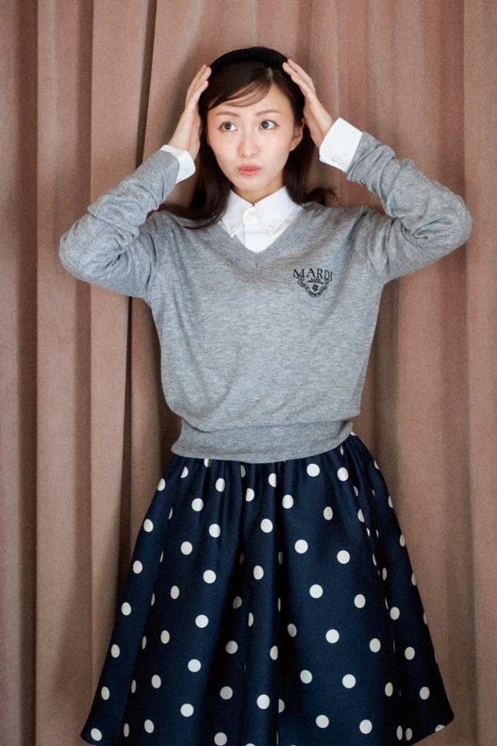グレーニット 15,400円、白シャツ 13,200円、ドット柄スカート 20,900円/以上Mardi Mercredi(MARDI MERCREDI JAPAN)カチューシャ 1,540円/ヴァンテーヌ
