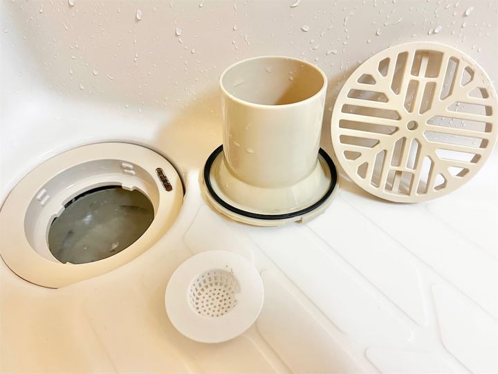 分解した部品はオキシ漬け、排水口にはオキシクリーンをかける