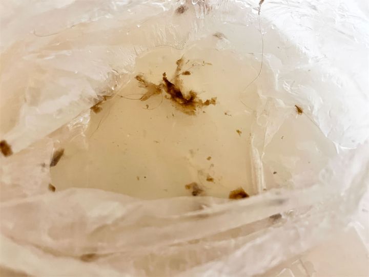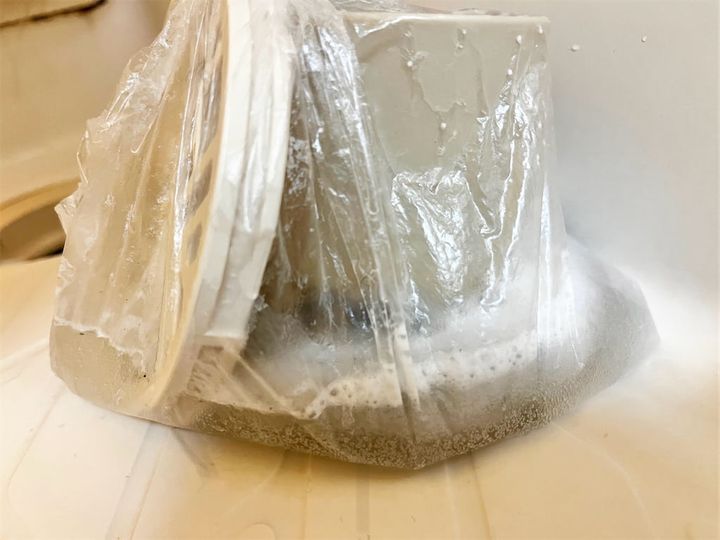 髪の毛などのゴミはオキシクリーンで溶けないので、事前に回収。排水口の部品を外し、オキシ溶液に漬けていきます。今回はオキシ漬けした容器を捨てたかったので、ビニール袋を使いました。バケツなどをオキシ漬けに使用する場合、変色の恐れがあるので金属製の容器は避けてください。