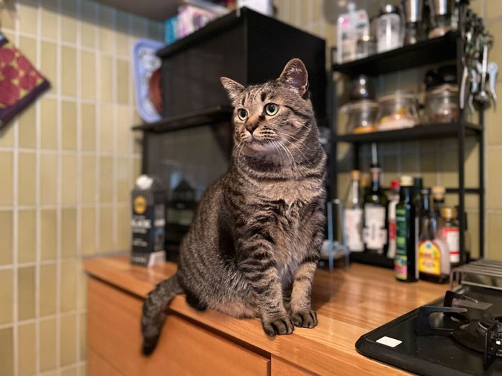 一番叱られるのは台所のコンロ横。賢いから火が付いてるときは絶対乗らへんで。調味料も舐めたりしないからな。この上にカリカリが置いてあるのは知ってるから、おやつアピールするときはここへ乗って主張するんやで。