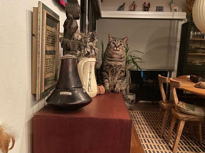 今日は、高いところに乗ってるコレクションを見せるで。地べたねこと思われてた方、ぼくはしっかりねこらしく高いところも登るし、物も落とすんやで。
