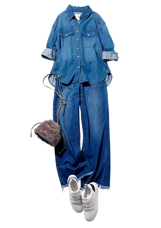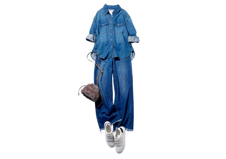 デニムシャツ¥18,700/アルページュストーリー デニムパンツ¥20,900/リエル リシェ スニーカー¥25,300/ルーニィ ファーバッグ¥13,200/ノエラ