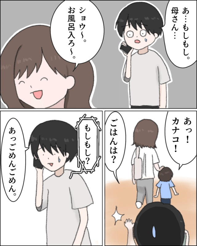 電話は案の定、義母からです。カナコさんはさっさとショウくんと一緒にお風呂に入ってしまいました。義母と電話をしながらも自分の夕飯を気にするユウタさんです。