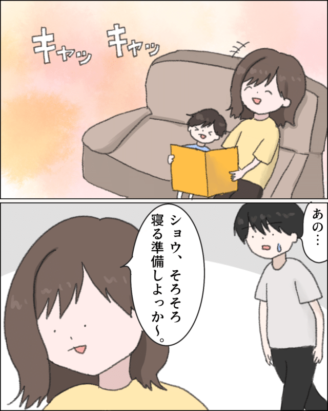まるでユウタさんがいないかのように、ショウくんが寝る時間まで絵本を読んで楽しそうに過ごすカナコさん。