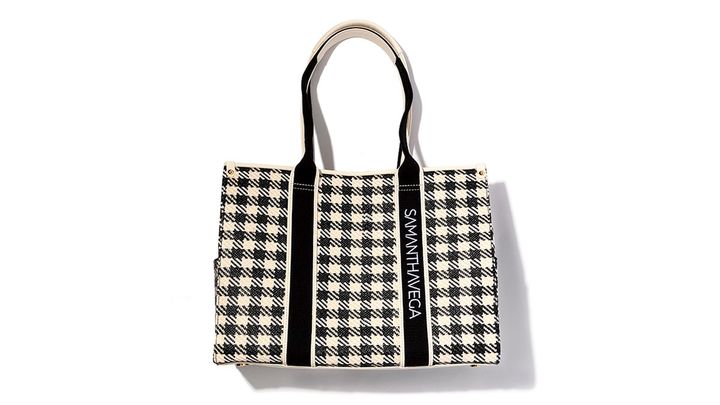 ガーリーなギンガムチェックもモノトーンなら幼くならず、オフィスカジュアルにぴったり。ブランドのロゴテープとスクエアフォルムが装いをクラスアップ。